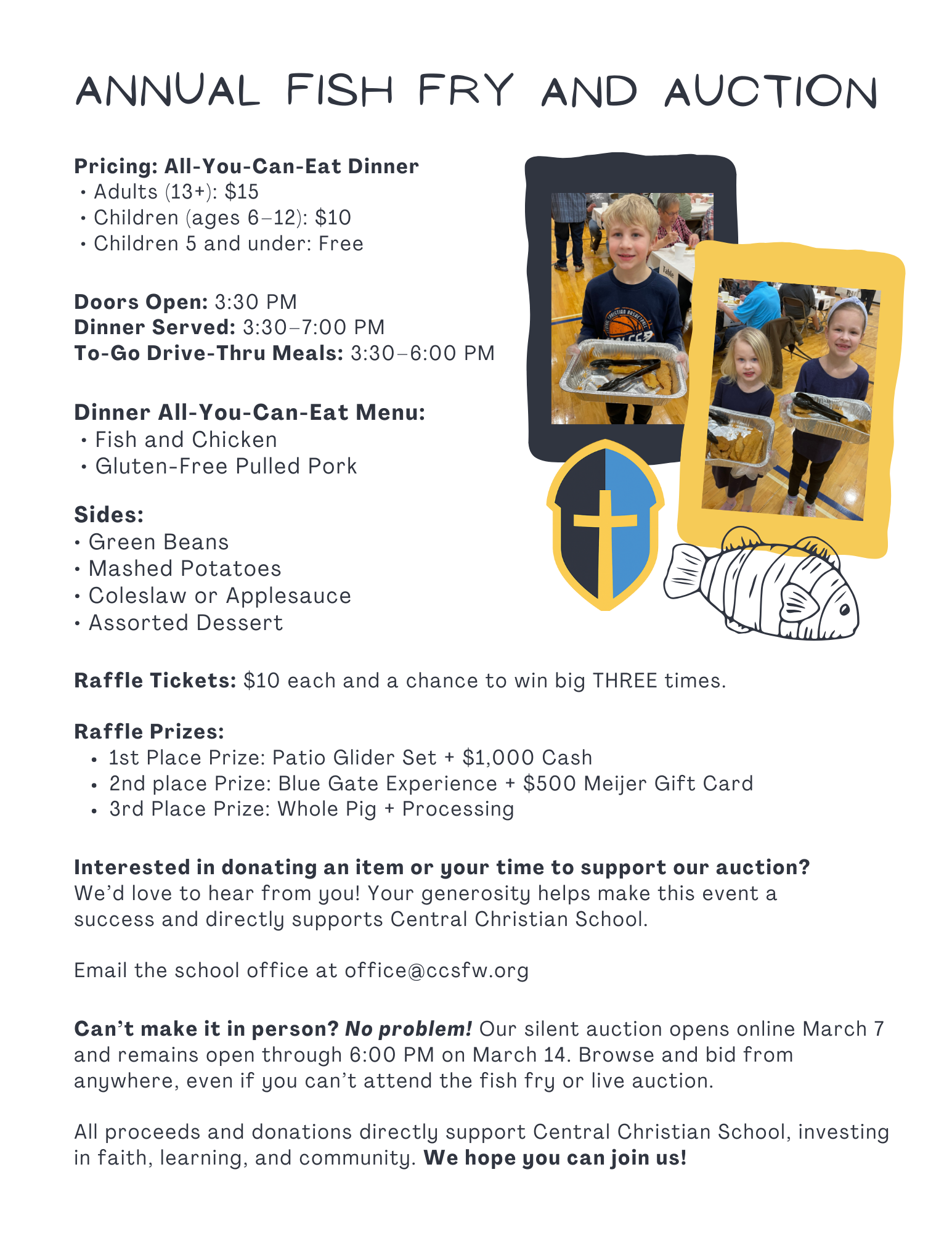 From all you can eat fish and chicken to winning some amazing auction items, our annual fundraiser is sure to be a good time! We look forward to this event every year and can’t wait to see you there!